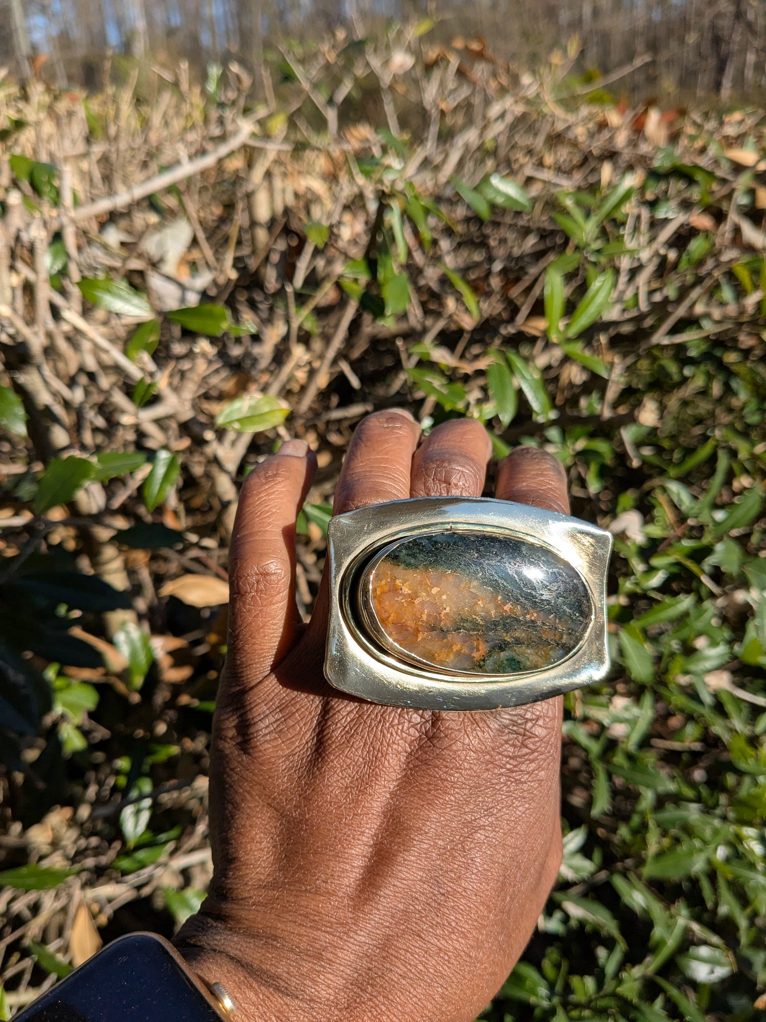 Gorgeous brass statement ring with a stunning moss agate center. Named after Henrietta Lacks, the woman whose stolen cells were pivotal in cancer research. Please specify your ring size in the notes when ordering as this doing is adjustable